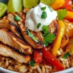 A flavorful and quick Chicken Fajita Rice Bowl recipe filled with grilled chicken, bell peppers, and onions, perfect for busy weeknights.