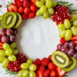 - Arrange the fruits in a circular pattern on a large platter, layering them to create a festive wreath appearance.