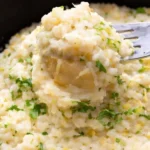 A comforting bowl of creamy Parmesan rice flavored with garlic and lemon, perfect as a side or light main course.