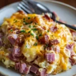 A comforting casserole with layers of ham, potatoes, and creamy goodness topped with melted cheese, perfect for family gatherings or busy weeknights.