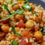 A delightful bowl of Garlic Tomato Chickpea Rice, celebrating heartwarming Mediterranean flavors.