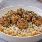 A flavorful dish of ground turkey meatballs served over zesty lemon herb rice, inspired by the vibrant tastes of Greece.
