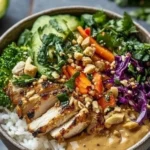 A delicious and healthy bowl combining juicy chicken, colorful veggies, and creamy peanut sauce, packed with protein.