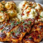A delicious and comforting dish combining tender chicken in honey BBQ sauce with creamy garlic parmesan potatoes.