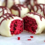 Delicate red velvet cake truffles coated in creamy white chocolate, perfect for any celebration or a sweet indulgence.