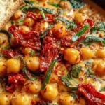 A comforting dish featuring creamy chickpeas in a rich sauce with garlic and sun-dried tomatoes, perfect for cozy dinners.