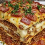 A delicious fusion of lasagna and cheeseburger, featuring layers of pasta, savory sauces, crispy bacon, and bubbling cheese.