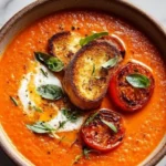 A warm and nourishing roasted tomato soup that captures the essence of comfort food with rich flavors of caramelized tomatoes and garlic.