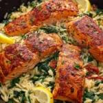 From the first sizzling sound in the skillet to the final vibrant presentation, this Salmon Orzo will transport you to a cozy Italian trattoria. The smoky notes of paprika envelop the salmon fillets, adding depth to its delicate flavor. Paired with creamy orzo, roasted red peppers, and vibrant spinach, every mouthful is a delightful harmony of textures and tastes. Plus, it comes together in just 30 minutes, making it a perfect weeknight dinner that dazzles without demanding hours in the kitchen!