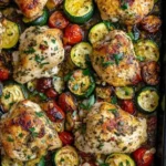 A delicious and effortless sheet pan chicken dish featuring juicy chicken thighs, vibrant zucchini, and cherry tomatoes, enhanced with fresh basil.