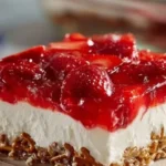 A delightful dessert with a crunchy pretzel crust, creamy layers, and refreshing strawberries, perfect for summer gatherings.